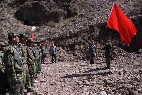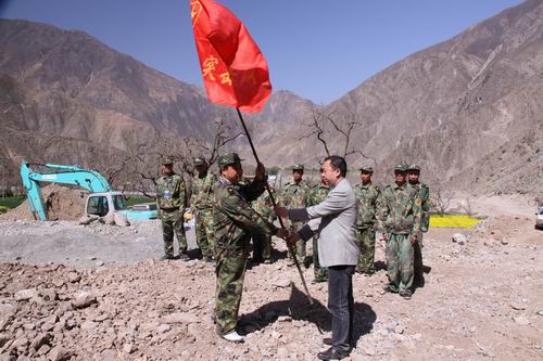 4月12日,公司黨委書記胡德生和甘肅預備役高炮師第一團政委陳德強一行前往舟曲慰問公司舟曲項目經理部災后援建一線施工人員。公司作為預備役預編單位,甘肅預備役高炮師第一團在公司舟曲項目經理部成立了第一支“甘肅預備役高炮師第一團舟曲災后重建突擊隊”,陳政委向突擊隊長鄭勇升授旗。
