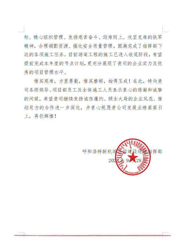 2023年9月28日,呼和浩特新機場項目建設現場指揮部給我司發來表揚信,信中充分肯定了我司在呼和浩特新機場項目建設中項目部全體員工統一思想錨定目標、精心組織管理、發揚艱苦奮斗、迎難而上、攻堅克難的鐵軍精神,合理調配資源、強化安全質量管理,圓滿完成了指揮部下達的各項施工任務。